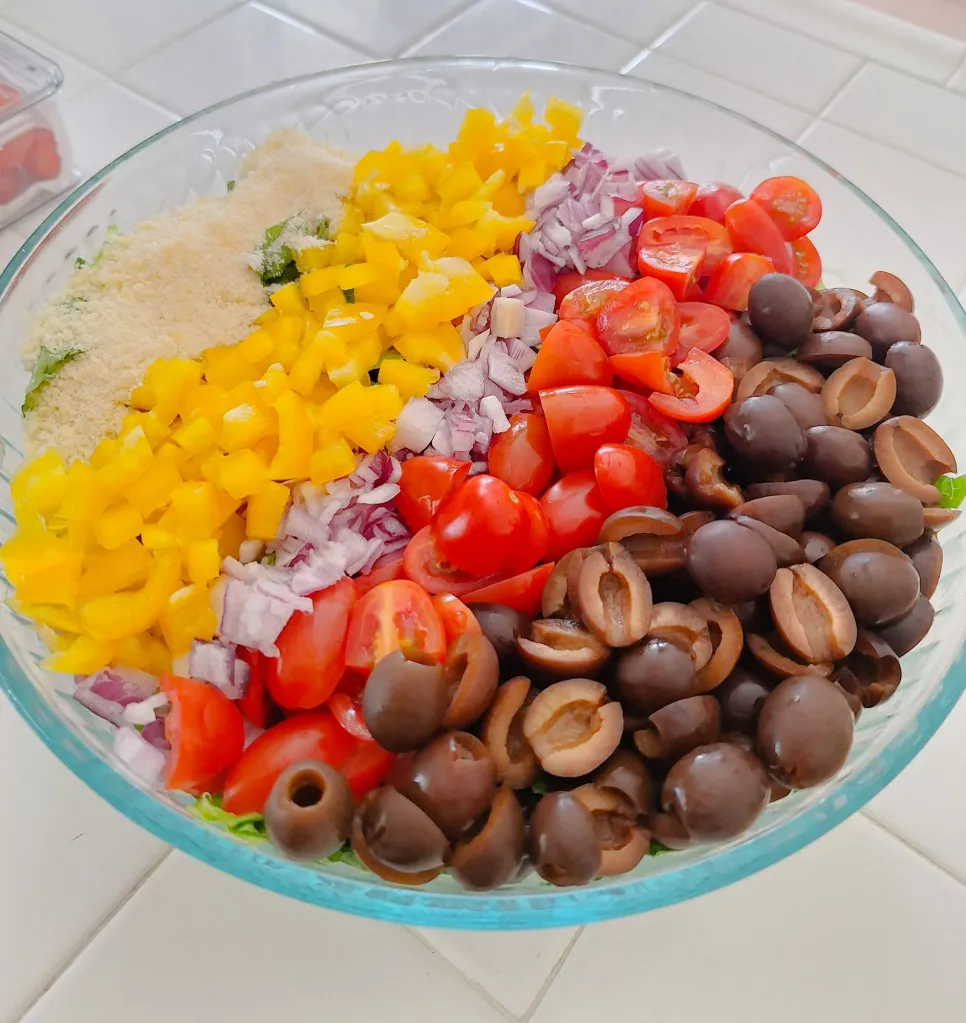 Pour the olive oil and lemon juice mixture over the salad. – Toss gently to ensure all ingredients are evenly coated with the dressing and the parmesan cheese is distributed throughout.